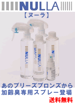 【ポシュレ通販でもおなじみ♪】驚異の消臭力97.4%!今日から始める加齢臭対策の決定版!加齢臭専用スプレーNULLA【ヌーラ】あの消臭繊維でおなじみ興和堂から加齢臭用消臭スプレーが仲間入り!気になる体 価格: 5,985円 レビュー評価:4.32 レビュー数:131 商品名 加齢臭用スプレーNULLA【ヌーラ】 セット内容 210mlボトル4本・(スプレーバルブ2個) 携帯用30mlスプレー1個 使用上の注意 ・直接肌に触れる衣類(下着)の場合には、消臭液が乾いてから着用ください。 ・毛・毛皮・和装品・水に弱い繊維には使用できません。・皮膚やペットには直接スプレーしないでください。 使用方法 加齢臭が付着した衣類寝具のカバーなどに全体が湿り気を帯びるくらいスプレーしてください。 翌日に着用予定の上着や下着の内側にスプレーをすると加齢臭対策に効果的です。 肌着にブリーズブロンズシリーズTシャツを合わせるとさらに効果があがります。 ポシュレ通販でも大人気の消臭 Supported by 楽天ウェブサービス |